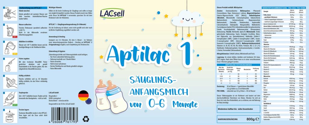 APTILAC® 1 ist eine vollständige Säuglingsanfangsnahrung, geeignet ab Geburt, wenn nicht gestillt wird oder nach ärztlicher Empfehlung zugefüttert werden muss. Stillen ist die beste Ernährung für Säuglinge und sollte so lange wie möglich fortgeführt werden.
