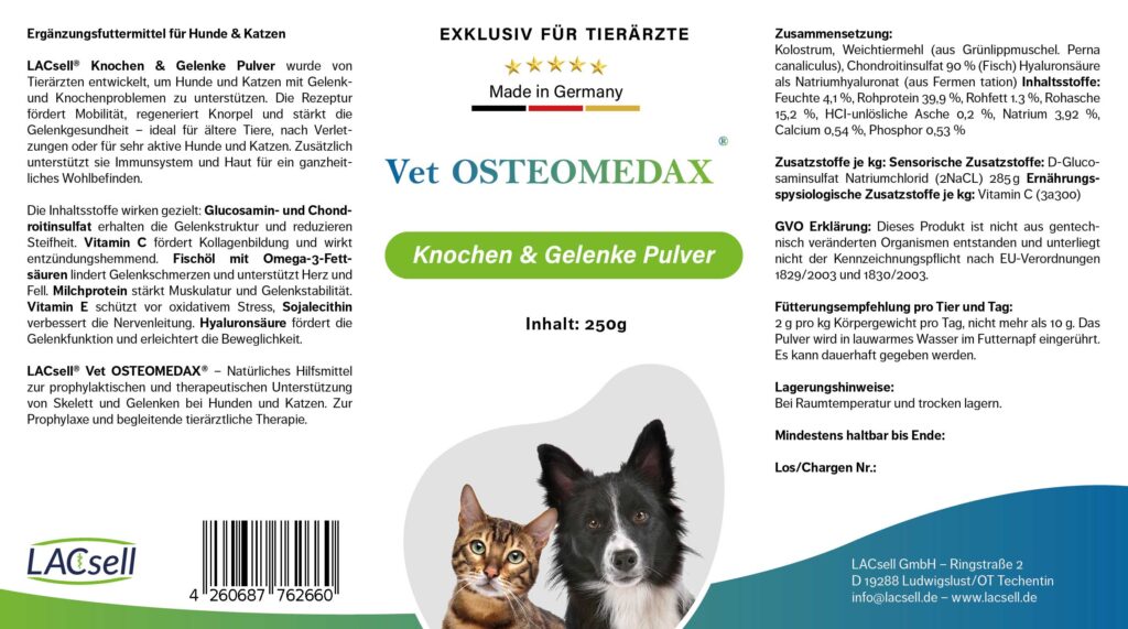 LACsell® Knochen & Gelenke Pulver wurde von Tierärzten entwickelt, um Hunde und Katzen bei Gelenk- und Knochenproblemen zu unterstützen.